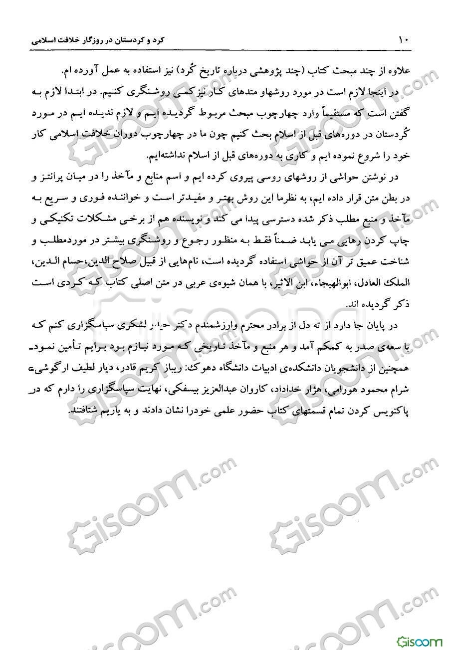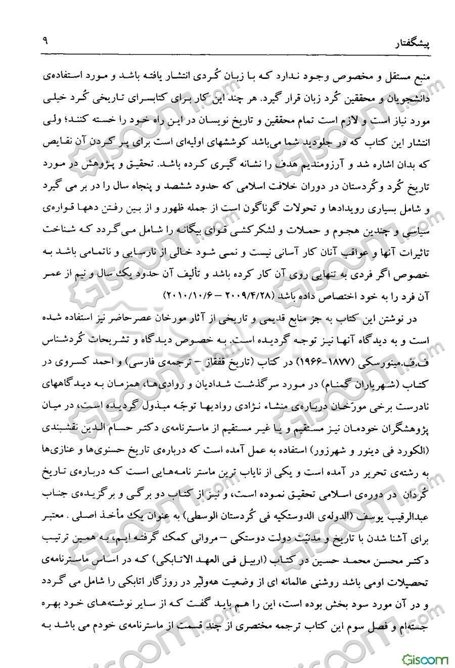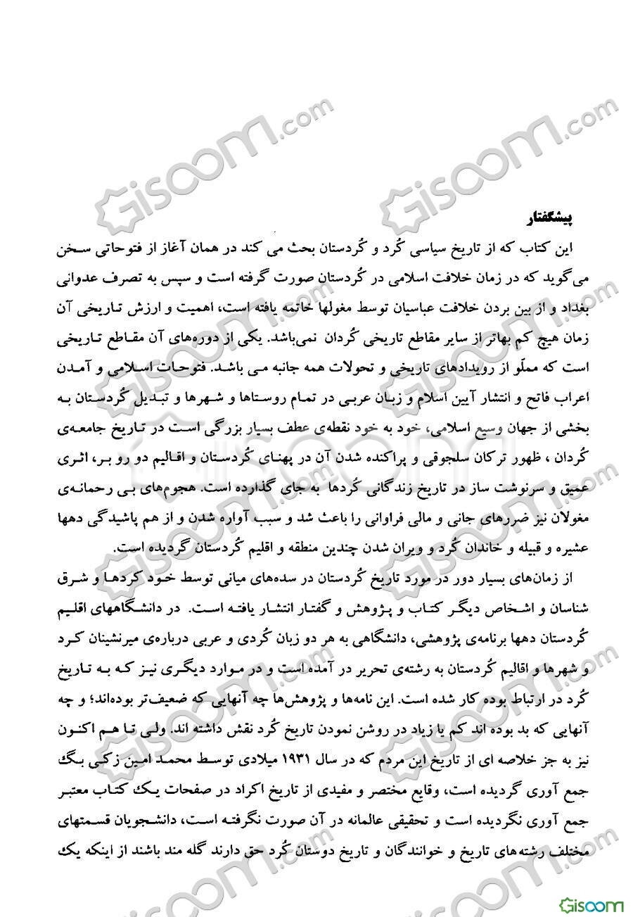 توضیح کتاب:موضوع کتاب حاضر، بررسی تاریخ سیاسی کرد و کردستان است. نگارنده ابتدا از فتوحاتی سخن میگوید که در زمان خلافت اسلامی در کردستان صورت گرفته و به تصرّف عدوانی بغداد و از بین بردن خلافت عبّاسیان توسّط مغولها خاتمه یافته است. مطالب اثر در هشت فصل تدوین شده است. در فصل نخست به اوضاع و احوال کردستان در روزگار فتوحات اسلامی و اثرگذاری آن در سیستم اداری خلفای اسلامی پرداخته شده است. در فصل دوم، تاریخ کرد در دورة اموی، بین سالهای 41 تا 132 هجری قمری مورد مطالعه قرارگرفته است. کرد و کردستان در دورة عبّاسی اوّل و دوم، دورة بویهی و در زمان هجوم ترکان سلجوقی، در پایان دورة خلفای عبّاسی و ایّوبیان، فصول دیگر این کتاب را شامل میشود. در فصل پایانی، هجوم وحشیانه و پرتاخت و تاز مغولها به کردستان تشریح شده است.