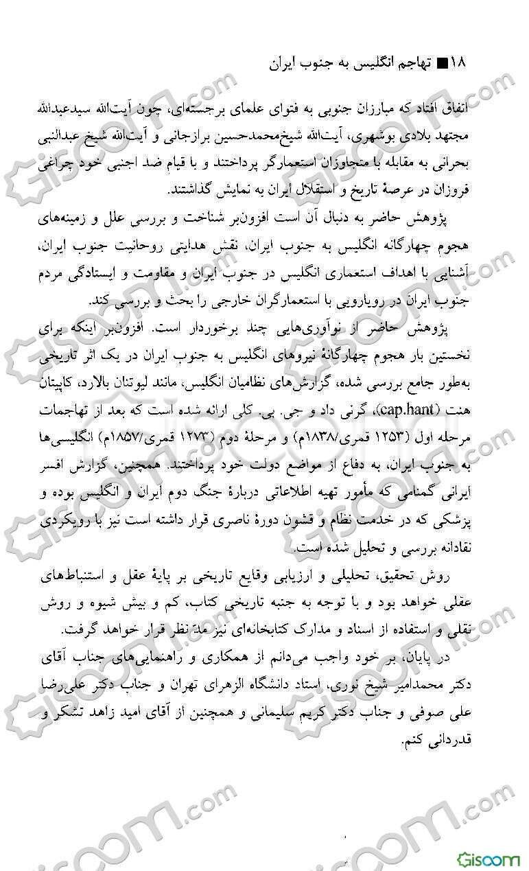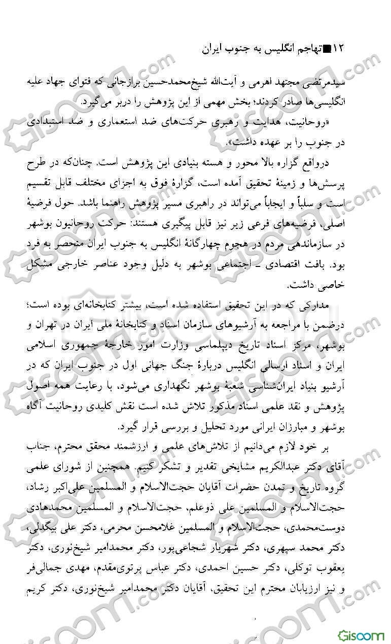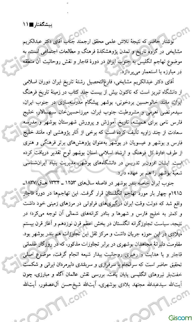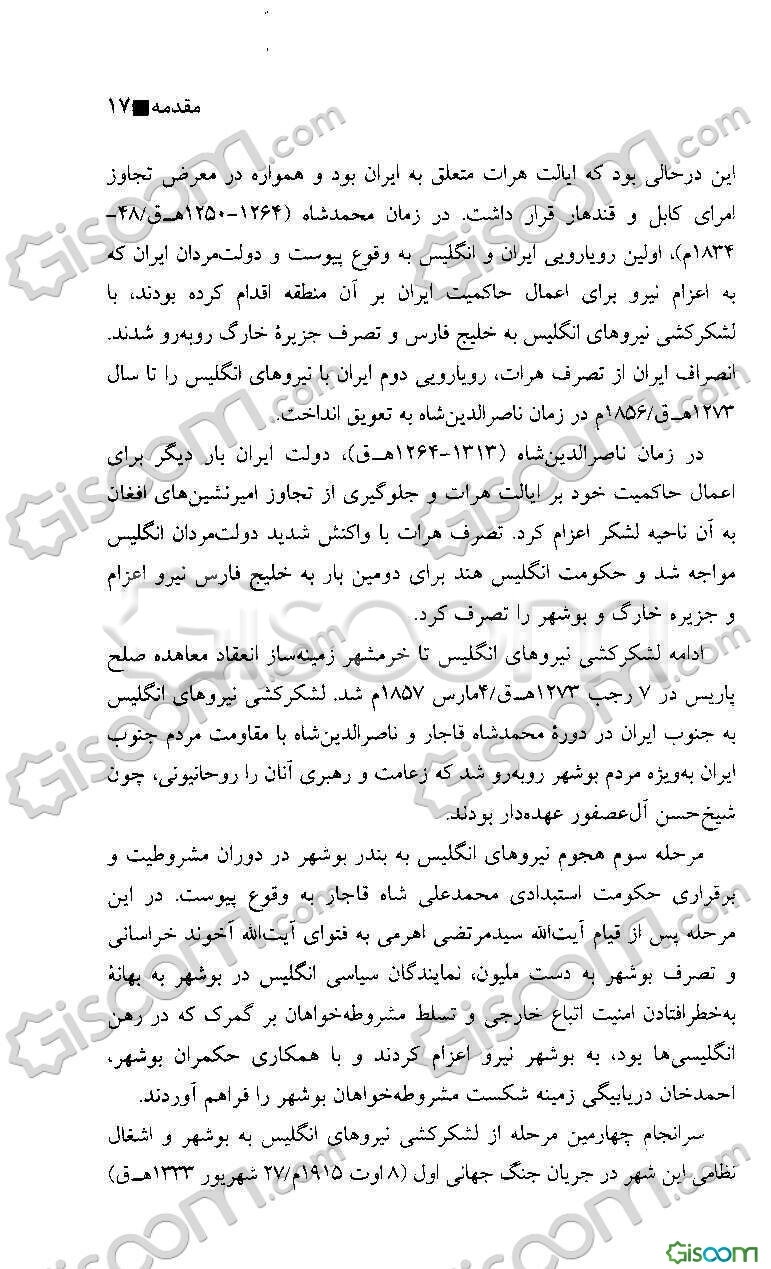 توضیح کتاب:بندر بوشهر در دوره قاجار در کرانه شمالی خلیج فارس معتبرترین بندر تجاری ایران بود که به دلیل اختلافات سیاسی دولتهای انگلیس و ایران بر سر مسأله هرات چهار بار مورد تجاوز نیروهای مهاجم انگلیسی قرار گرفت. مردم غیور بوشهر با پیروی از فرامین علمی روحانی در شرایطی به دفاع از آب و خاک ایران قیام کردند که دولت زبون و ضعیف قاجار هر روز بر اساس امتیازی گوشههایی از این سرزمین را به بیگانگان واگذار میکرد. در کتاب حاضر این بخش از تاریخ معاصر ایران مورد بررسی و تحلیل قرار گرفته است.