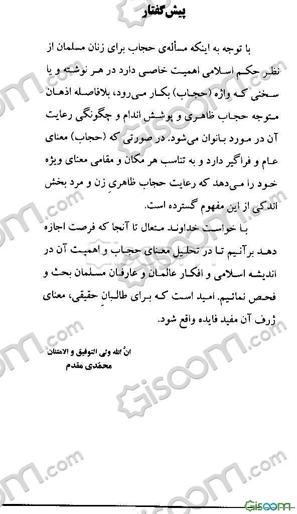 توضیح کتاب:در کتاب حاضر ضمن ترجمه لغوی حجاب و معنای اصطلاحی آن به اهمیت حجاب در اندیشه اسلامی و افکار عالمان و عارفان مسلمان پرداختهاست. انواع حجاب حجاب و محتوای احادیث وجوه غیب و انواع حجاب با وجود نامحرم حجاب الزامی است، عناوین مباحث این کتاب است.