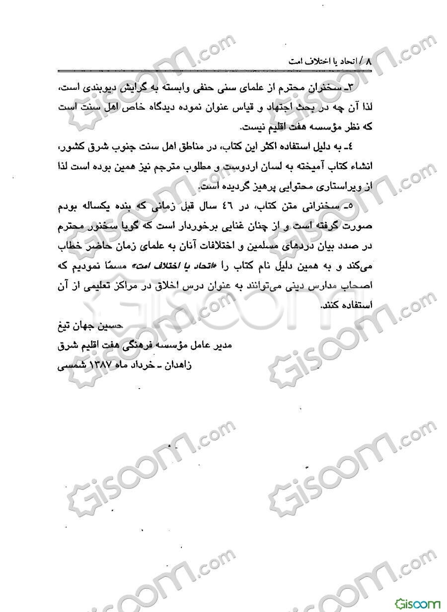 توضیح کتاب:این اثر متن دو سخنرانی از مولانا «محمد شفیع عثمانی» مفتی اعظم وقت پاکستان است که در باب اتحاد امت اسلامی و علاج دردهای آن صورت پذیرفته است. این سخنان در شهر لاهور بعد از دوران رهایی از استعمار انگلیس و تاسیس کشور اسلامی پاکستان به نام دارالسلام در مقابل دارالحرب هندوهای هند ایراد گردیده است. وی از علمای سنی حنفی وابسته به گرایش دیوبندی است و لذا برخی از مطالب بیان شده در خصوص اجتهاد و قیاس، خاص اهل سنت میباشد. این سخنان به زبان اردو در مجلات پاکستان و برگردان آن نیز در فصلنامه هفت اقلیم به صورت مسلسل چاپ گردیده است.