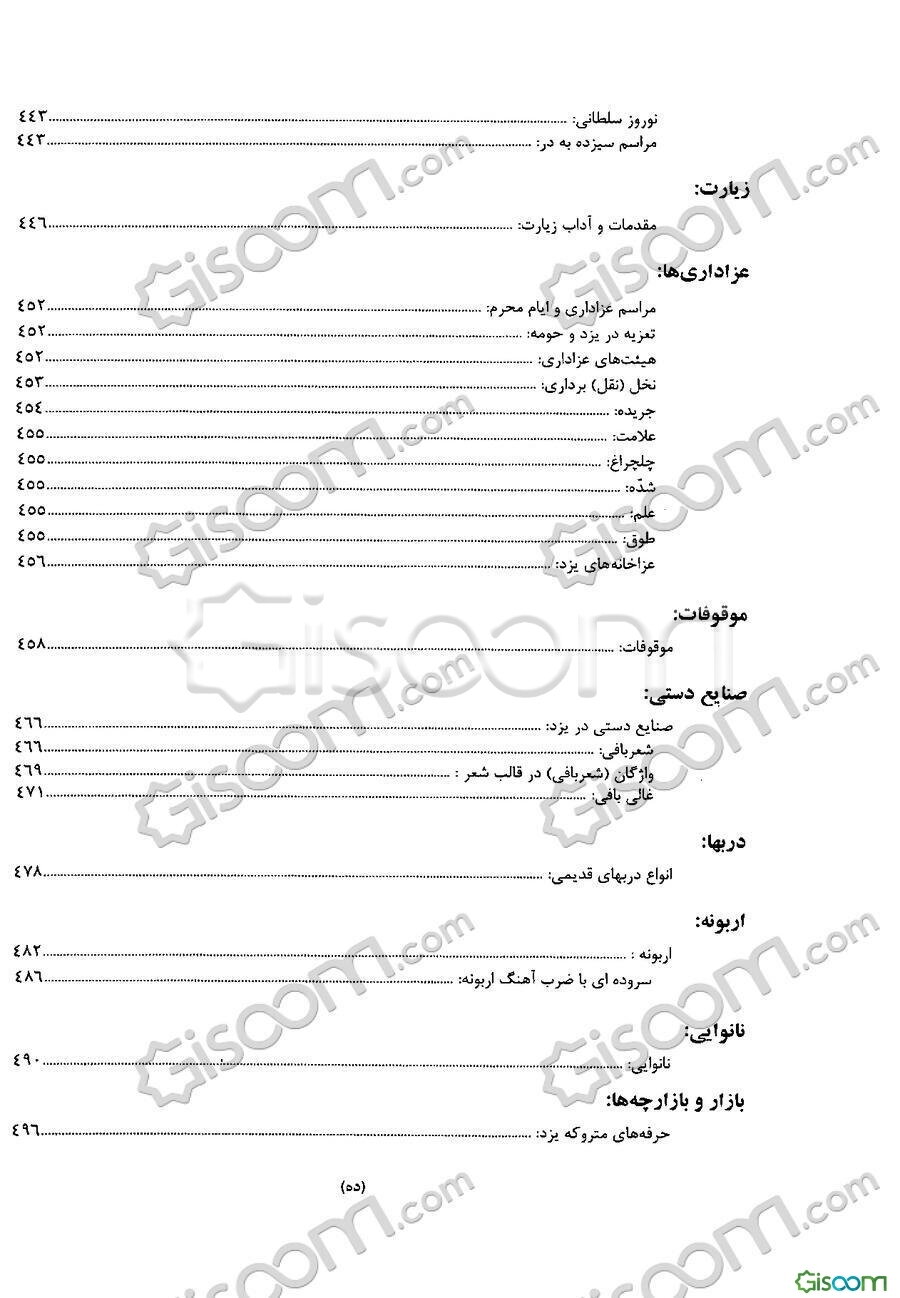 توضیح کتاب:کتاب حاضر دربارة فرهنگعامه و بنیانی شهر یزد است. در ابتدا درآمدی بر فرهنگ و تاریخ این شهر قدیمی نگاشته شده است. «بازی سنتی کودکان»، «بازیهای سنتی و نمایشی»، «داستانهای عامیانه»، «ترانههای محلی»، «آداب معاشرت»، «غذاها و خوراکیها» عنوانهای موضوعی برخی از فصلهای این کتاب هستند. در این فصلها، حمامها، بازارها، صنایعدستی، عزاداریها، خواستگاری، مکتبخانهها، نامهنگاری، اصطلاحات رایج، زرتشتیان و طب عامیانه در این شهر مورد بررسی و توجه قرار گرفته است.